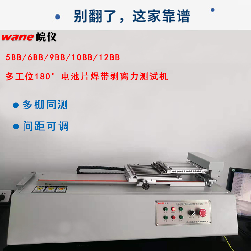12BB電池片焊帶剝離強(qiáng)度試驗機(jī)兼容3BB/5BB/6BB/9BB/10BB/12BB電池片多工位多通道,兼容156mm/158.75mm/166mm/210mm/230mm等不同尺寸電池片,MBB電池片專用測試夾具可根據(jù)不同柵線間距,夾具可調(diào),操作簡便,省時、省力。多柵同時測試,夾具端移動,傳感器測試過程中靜止不動,更好的保證測試精度。